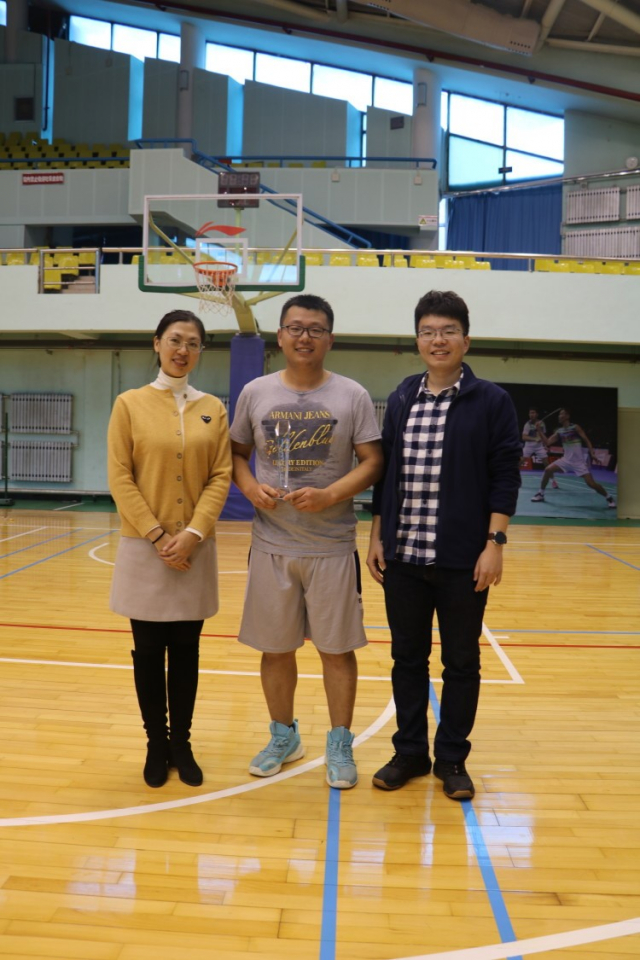 赛后,蒋楠老师、孙宗斌老师、王旭东老师分别为冠亚季军队伍颁发奖杯并合影留念,久久热 “新生杯”篮球赛也圆满落幕。