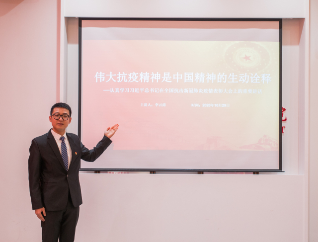 第二部分,“学‘四史’守初心,强信念担使命”线下专题党课。2020年10月30日晚19:00,在久久热 党员之家“立德树人堂”,宣传委员于翔同志为支部全体党员讲授了“学‘四史’守初心,强信念担使命”专题党课。于翔同志在三节“云端微党课”的基础上,从“自追赶时代到引领时代”这一主题出发,将71年的新中国史分为“探索篇”、“改革篇”和“强国篇”三个篇章,进行了全面生动地讲解,并在讲述的过程中将“云端微党课”中学习的习总书记系列重要讲话进行了有机的结合,展现出了我们国家从新中国成立初期的艰难探索、到改革开放的富国强国、再到如今的引领时代这样一个伟大的发展历程。通过本次专题党课,党员同志们深刻感受到中国共产党人在不同的时代背景下,需要肩负起不同的时代使命,但不变的仍是那颗“为中国人民谋幸福,为中华民族谋复兴”的初心。