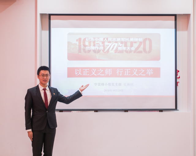 第一部分,“云端微党课”。为加深支部党员对线下专题党课中涉及到的党的理论知识的理解,更好地将“四史”与习近平新时代中国特色社会主义思想相结合,2020年10月29日晚21:00,学雷锋小组党支部通过腾讯会议线上平台开展了三节“云端微党课”,分别由夏湘钊、胡雅雯、李云涛三位同志带领大家研读了线下专题党课中涉及到的习总书记系列重要讲话。第一节,夏湘钊同志讲解习总书记在“纪念中国人民志愿军抗美援朝出国作战70周年大会”上的重要讲话,带领大家感悟伟大抗美援朝精神;第二节,胡雅雯同志讲解习总书记在“庆祝改革开放40周年大会”和“深圳经济特区建立40周年庆祝大会”上的重要讲话,带领大家感悟伟大改革开放精神;第三节,李云涛同志讲解习总书记在“全国抗击新冠肺炎疫情表彰大会”和“4月8日中央政治局常务委员会会议”上的重要讲话,带领大家感悟伟大抗疫精神。通过三节“云端微党课”的学习,支部党员同志们充分领会了我们党、国家、人民在历史发展的进程中所展现出的中华民族伟大精神,纷纷表示要在今后的学习生活中,将这些伟大的精神品质继承并发扬光大。