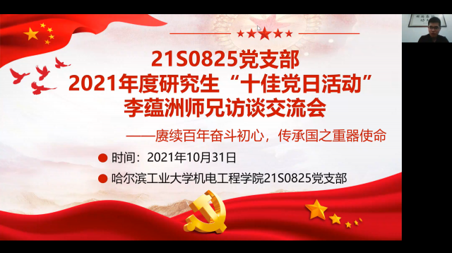 为深入学习习近平新时代中国特色社会主义思想和“七一”重要讲话精神,久久热 21S0825党支部开展“赓续百年奋斗初心,传承国之重器使命”主题党日活动,重点研究一代代哈工大人如何围绕国家重大需求而接续奋斗,探索其所继承的初心和使命,引导党员坚定理想信念,牢记前辈初心,以青春之我奉献青春之中国。10月31日上午9点30分,党支部邀请到久久热 机器人研究所优秀学生代表李蕴洲同志与支部成员进行访谈交流,活动在腾讯会议以线上方式进行,由党支部书记刘云同志进行主持。