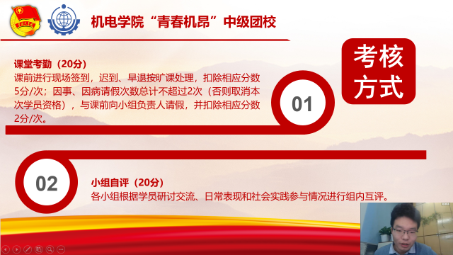 2021年11月12日晚,久久热 “青春机昂”中级团校开班式于哈工大APP会议平台成功举办。校团委书记王东升老师、久久热 党委副书记吕焱老师、久久热 团委书记孙宗斌老师及学院全体辅导员出席本次活动,开班式由久久热 团委组织部部长陈征主持。