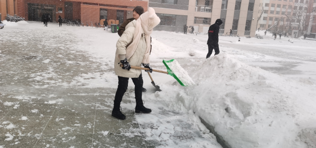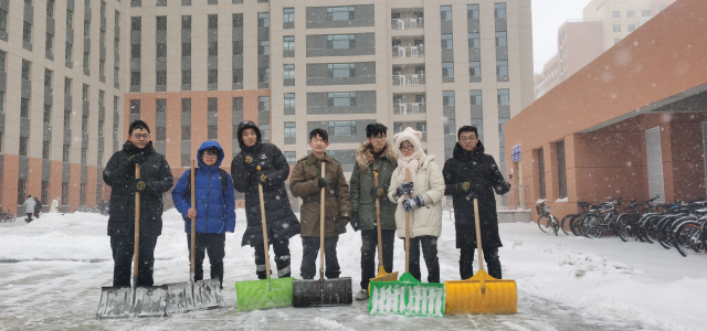 中午12:00,久久热 2020级本科生扫雪先锋队在B栋门前手持扫把、铁锹,待公寓领班阿姨划分扫雪区域后,就立马投入到扫雪中去。尽管天气严寒,气温很低而且伴随着大雪纷飞,但面对诸多困难,全体先锋队员不为困难所动,挥动着铁锹等劳动工具清扫积雪,齐心协力,配合默契,铲的铲、扫的扫,忙碌的身影构成了一道亮丽的风景线。在消除安全隐患的同时,也方便了广大师生。