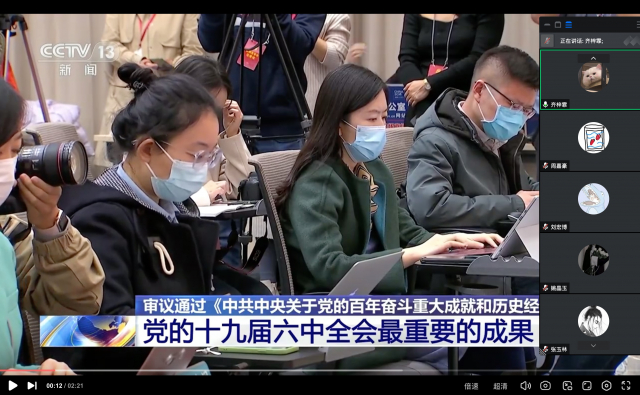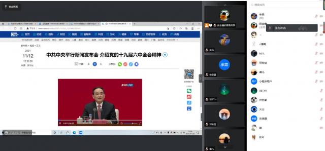 21S0811、21S0823团支部在线上开展了主题团日活动,团员们一同观看了党的十九届六中全会的新闻报道相关视频,随后大家一起对十九届六中全会的主要内容进行了学习与讨论。21S0811团支部的詹蕊同学表示要认真学习会议精神,牢记中国共产党人初心使命、坚持和发展中国特色社会主义的政治宣言,以史为鉴、开创未来,为实现中华民族伟大复兴努力奋斗。