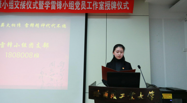 大会第四项,学雷锋小组交接仪式,第十五届学雷锋小组团支部书记杨诗佳从第十四届学雷锋小组团支部书记吴禹锡手中郑重接过了光荣的学雷锋小组锦旗,带领全体学雷锋小组成员宣誓向雷锋同志学习,倡议全体成员学习雷锋精神,树立时代新风。同时讲述了2008001、20008012团支部在“疫情防控”“文明交通”“清洁家园”中书写的志愿服务故事,并表示新一届学雷锋小组团支部将继续继承和发扬雷锋精神,深入开展学雷锋活动,推动学雷锋活动常态化。