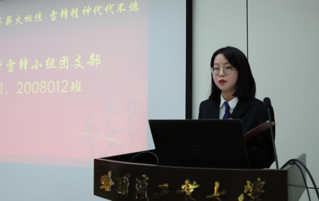 大会第四项,学雷锋小组交接仪式,第十五届学雷锋小组团支部书记杨诗佳从第十四届学雷锋小组团支部书记吴禹锡手中郑重接过了光荣的学雷锋小组锦旗,带领全体学雷锋小组成员宣誓向雷锋同志学习,倡议全体成员学习雷锋精神,树立时代新风。同时讲述了2008001、20008012团支部在“疫情防控”“文明交通”“清洁家园”中书写的志愿服务故事,并表示新一届学雷锋小组团支部将继续继承和发扬雷锋精神,深入开展学雷锋活动,推动学雷锋活动常态化。