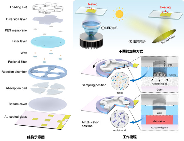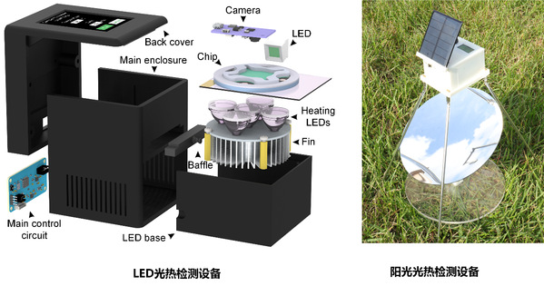 针对这一问题,团队成功研制出一种紧凑型高灵敏度光热等温扩增芯片,可同时检测多类型样本中的多种疾病。芯片上的核酸扩增通过LED照明或阳光聚焦驱动的等温扩增实现,在样品添加过程中自主富集核酸,检测限低至每微升0.2拷贝数。该研究通过120份血清及鼻咽拭子临床样本,实现了乙肝、丙肝、新冠、甲流、腺病毒以及艾滋病快速诊断,检测准确率为95%,特异性为97.5%。该设备可在医疗机构、检疫站和疾病监测站等场所广泛应用,助力快速精准检测。