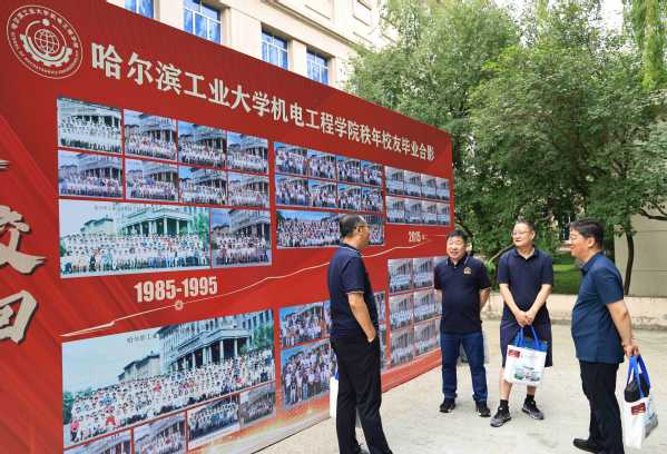 上午,校友们在机械楼门前报到,领取学院精心准备的纪念品,并在签名墙前合影留念。他们在机械楼前热烈交流,分享毕业后的成长经历;在阶梯教室里欢声笑语,回顾在哈工大的求学过往;在照片墙前驻足凝望,追忆学生时代的点滴时光。